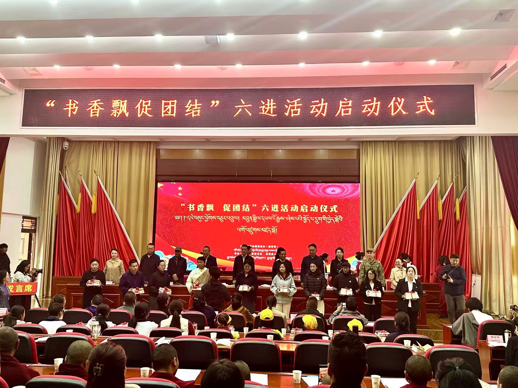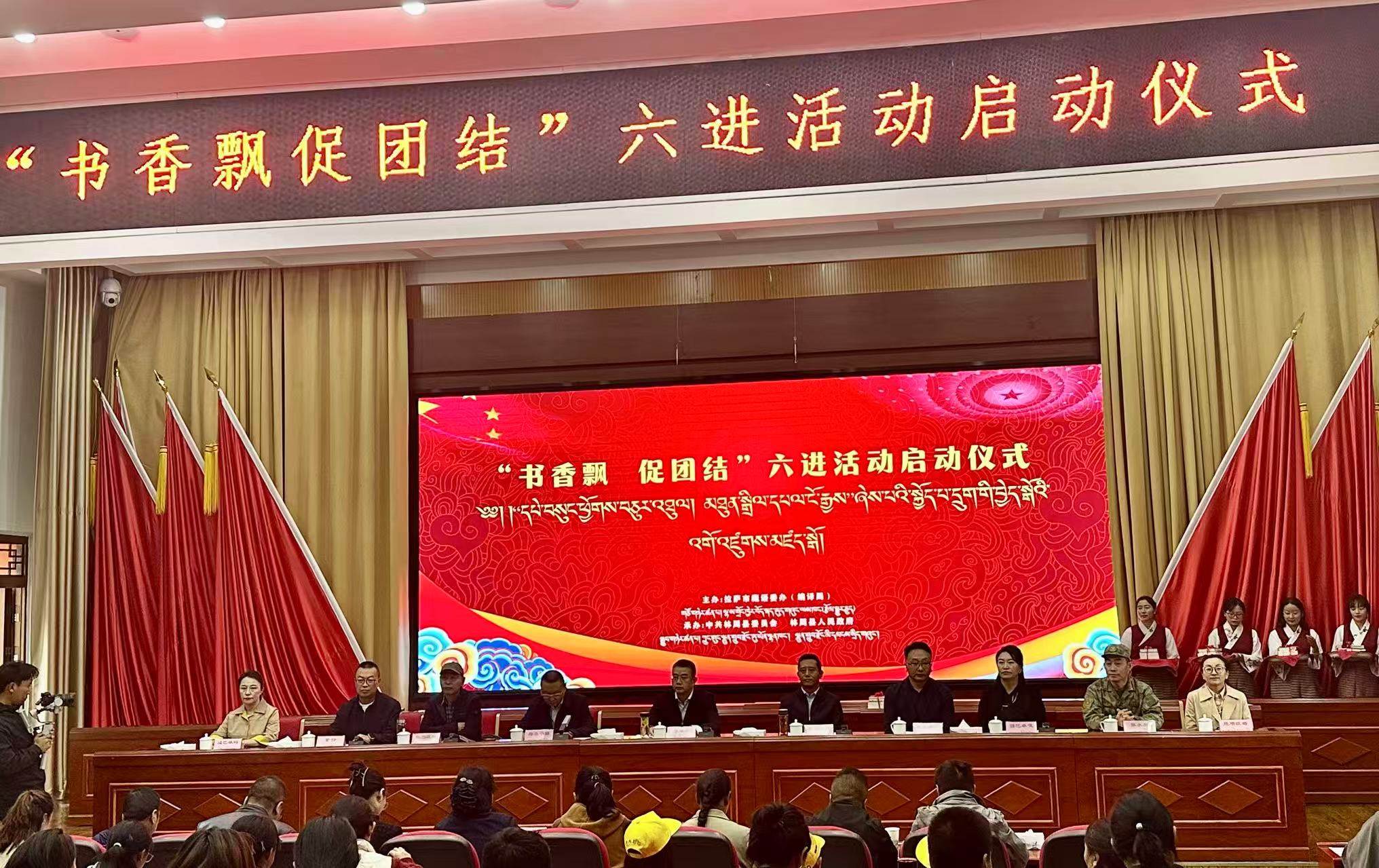 为全面学习贯彻西藏自治区成立60周年庆祝大会精神,把习近平总书记对西藏各族人民的亲切关怀和对西藏工作的各项要求,传递到千家万户,通达基层“末梢”,进一步唱响“看着北斗星走不迷路、跟着共产党走会幸福”主旋律,持续推进民族团结进步事业,全力助推国家通用语言文字普及使用,促进各民族交往交流交融,近日,由拉萨市藏语委办(编译局)主办,林周县委、县政府承办的“书香飘 促团结”六进活动启动仪式在林周县举行。市委组织部、市委宣传部、市委统战部、市退役军人事务局、市民委及林周县委主要负责同志出席启动仪式。拉萨市翻译工作者协会、拉萨市各县(区)藏语委办(编译局)及林周县干部群众代表、师生代表、部队代表、寺庙僧尼代表、驻村驻寺代表和各乡(镇)、县直单位120人参加启动仪式。