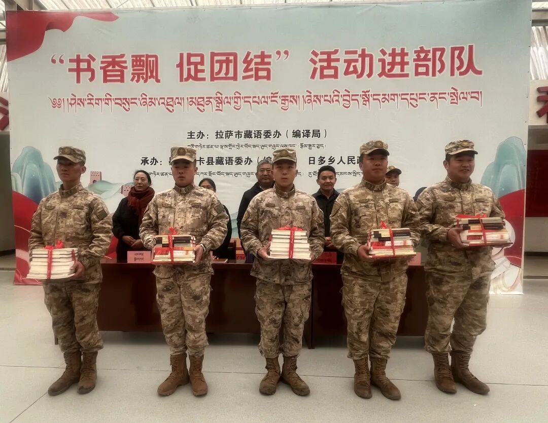 活动现场,拉萨市藏语委办(编译局)向分队官兵及乡退役军人、民兵赠送了《习近平金句》《国通语500句》《藏汉新词术语汇编》等700余册图书。此次活动以书籍为桥梁,搭建了军民之间交往、交流、交融的平台,促进官兵与各族群众在文化上相互学习、情感上相互亲近,进一步夯实了民族团结的思想根基。