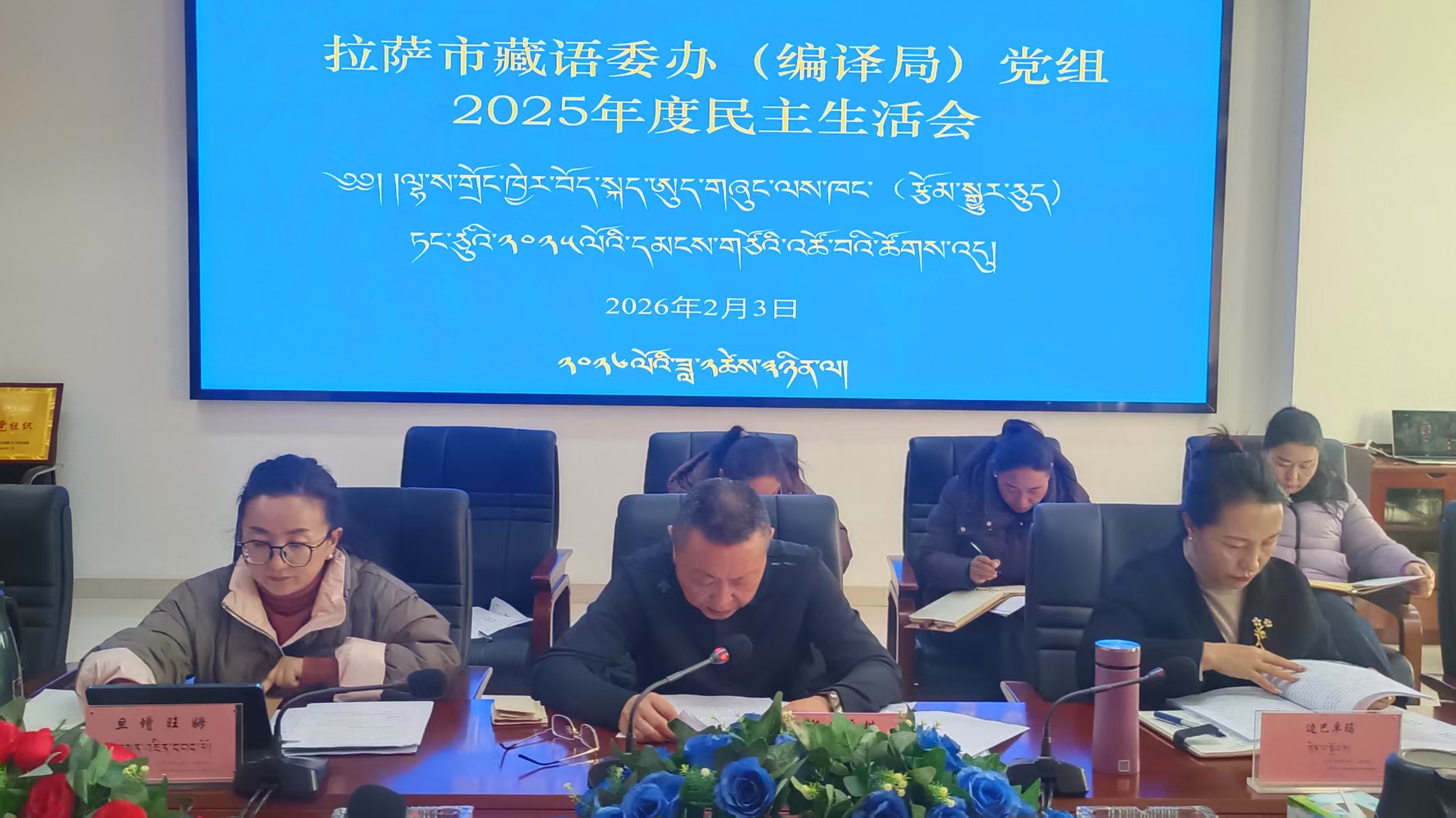 2月3日,拉萨市藏语委办(编译局)召开党组班子2025年度民主生活会。市委组织部部务委员、公务员局局长、督导组组长李园霞同志到会指导并作点评。“两代表一委员”、退休干部代表和群众代表列席会议,会议由党组书记格桑平措同志主持。
