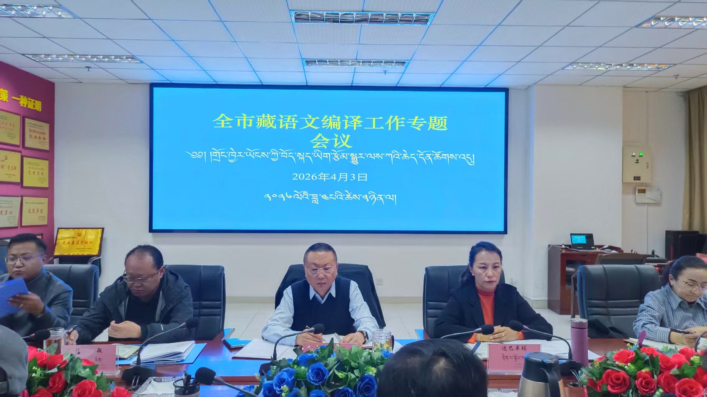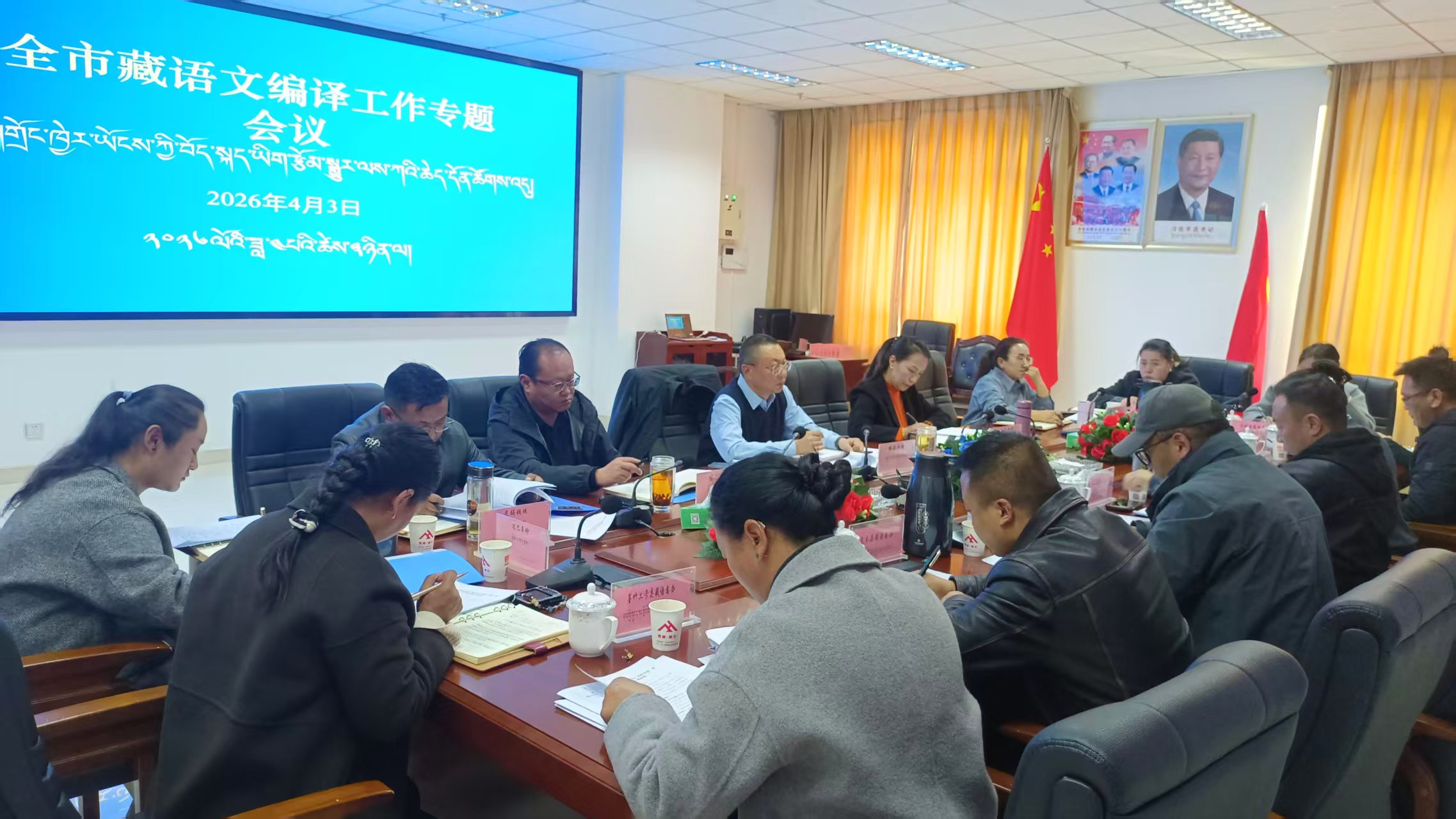 4月3日,拉萨市藏语委办(编译局)召开藏语文编译工作专题会,深入学习贯彻国家、自治区关于语言文字工作的相关精神,结合正确政绩观学习教育,总结一季度工作,分析存在问题,安排部署下一阶段重点任务。市藏语委办(编译局)党组书记格桑平措主持会议并讲话,各县(区)藏语委办(编译局)主要负责人、办(局)班子成员及各科室负责人参加会议。